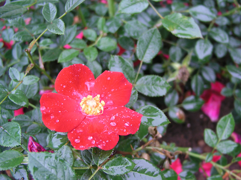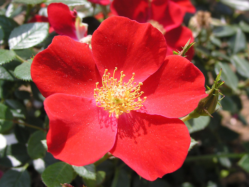 鮮やかな赤に金色のしべが美しい、一重のバラを咲かせます。